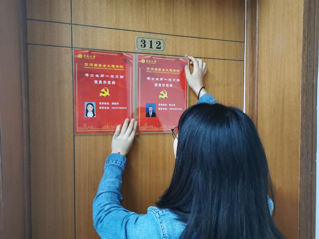 博士一支部设立“党员示范岗”,精心制作了张贴标牌,旨在要求每名党员亮明党员身份,强化党员意识,加强党性修养,严守党员标准,坚持以知促行、知行合一,做到道德品质好,政治思想好,组织纪律好,学业水平好,为民服务好的“五好”示范。