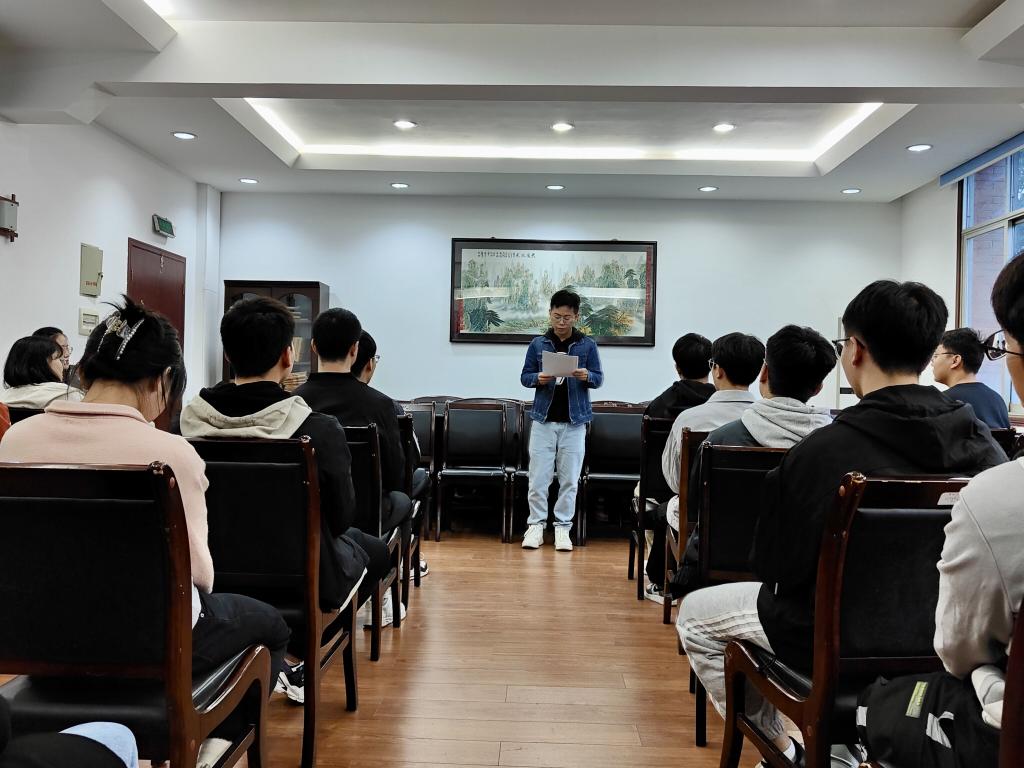 在见面会上,孙瀚老师首先向大家介绍了学生组织构成,并根据组织以往取得的成绩——湖南省红旗团委,引出了传承精神。孙瀚老师倡导大家继承发扬这项精神,同时心中保持信念,不断前进,共同建设更加优秀的学生团体。随后,孙瀚老师向大家提出几点期盼,要求大家在认真工作的同时不断反思,积累工作经验,提高工作效率,提升工作方法。讲话中,大家明确了学生组织的目的是服务同学,也明确了积极建设优秀团体的目标。