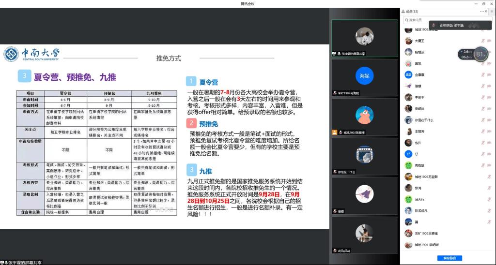 张宇霖、李辰宇、章斌三位同学结合自身的经历,分别介绍了各自关于保研的材料准备、文字材料的撰写、不同高校夏令营选择以及面试的相关技巧等,帮助同学们了解了夏令营的相关信息,给同学们提出了合理的建议。