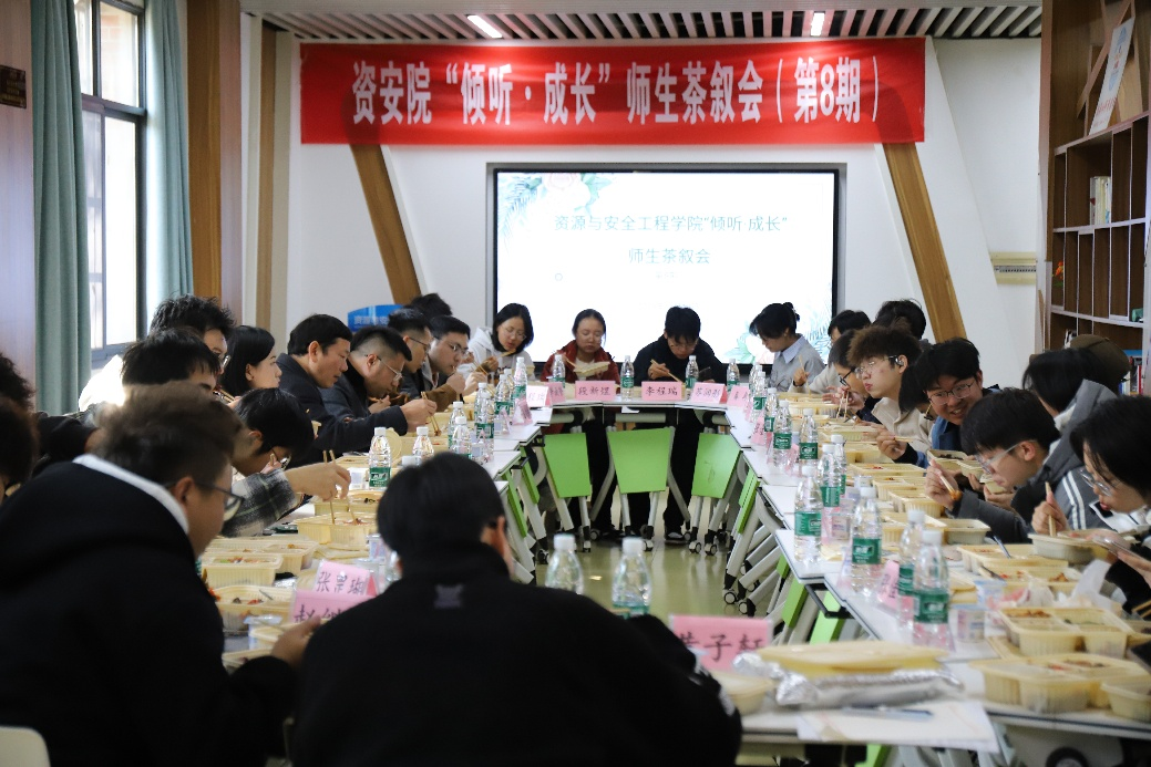 在采矿楼懿德馆举办“倾听·成长”师生茶叙会(第8期)。学院党委副书记岳龙,安全系李孜军教授、采矿系李帅教授、城地系吴金标老师、班导师代表韩震宇老师,以及全体本科2025级新生班长、团支书、副班长共同参与。活动由辅导员黄佳星老师主持。
