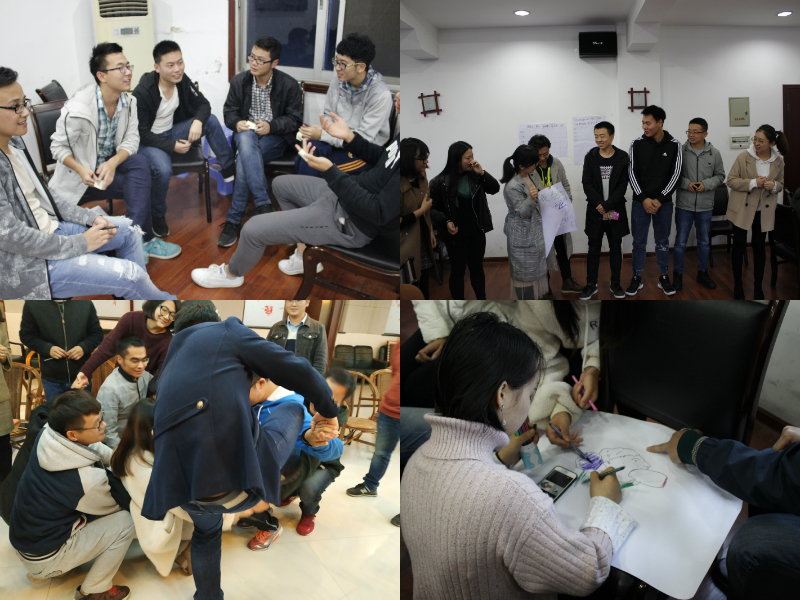 其后,老师们针对不同的团辅对象设计了不同的游戏与互动环节。“滚雪球”在考验记忆力的同时,加深了同学们对彼此的了解;团队展示环节,各小组成员各尽所能,有趣的队名、响亮的口号展示出各自团队的特色与凝聚力。 此外,本次团辅还设计了“手忙脚乱”、“啄木鸟”、“背背传”等多种趣味游戏。李欢老师带领硕士1802班进行的“蝴蝶飞”环节在锻炼同学们观察力和反应力的同时,加深了团队成员之间的友谊。于谦老师带领博士1801班进行的“解开千千结”环节充满趣味性,增强了同学们团队合作的意识。经过一系列的游戏与互动环节,活动现场的气氛达到高潮。