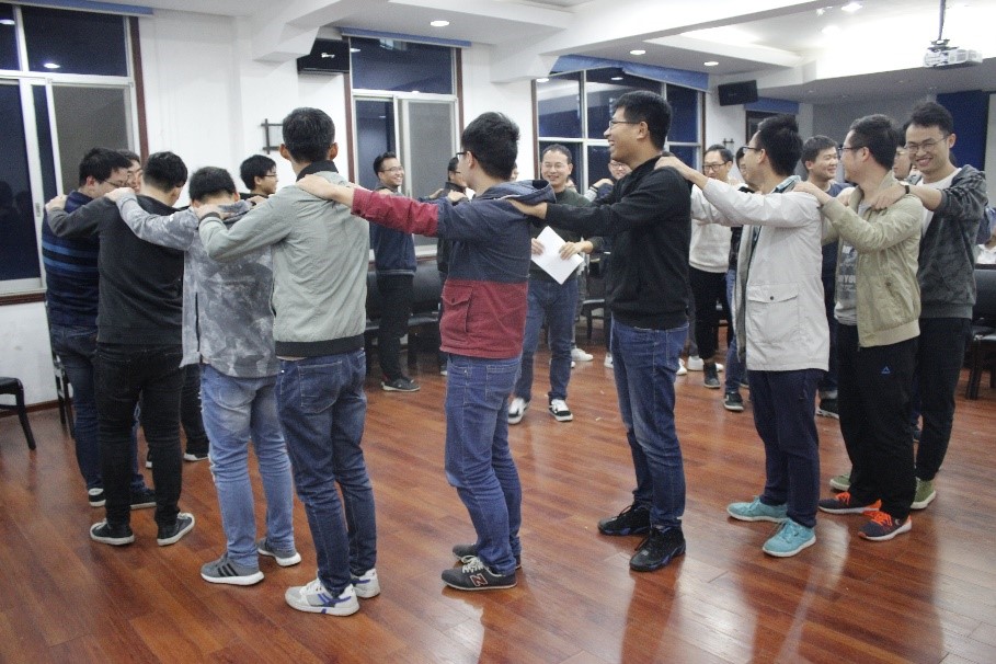 紧接着,于谦老师按照座次将参加活动的同学分成四个队,并给15分钟的时间让队员彼此熟悉并为本队确认队名、队号、队歌以及团队契约,每位队员也都积极地出谋划策,最终四个队都想出了富有特色的内容。为了让队员加深了解,于谦老师让每个队比赛“名字滚雪球”游戏,即让队伍站成一排,后一位队员需要说出前面所有队员的城市、爱好以及名字,最终四支队伍按照用时长短得到分数,加上队伍与队伍之间的内投得分即为本队最终得分,得分最高的队伍会获得主办方精心准备的礼物。随后的“解开千千结”游戏环节,帮助参与的同学们体验到互相配合的重要性。当全部24名同学在配合下手拉手回到初始的圆圈状态后,每位同学脸上都洋溢着喜悦。