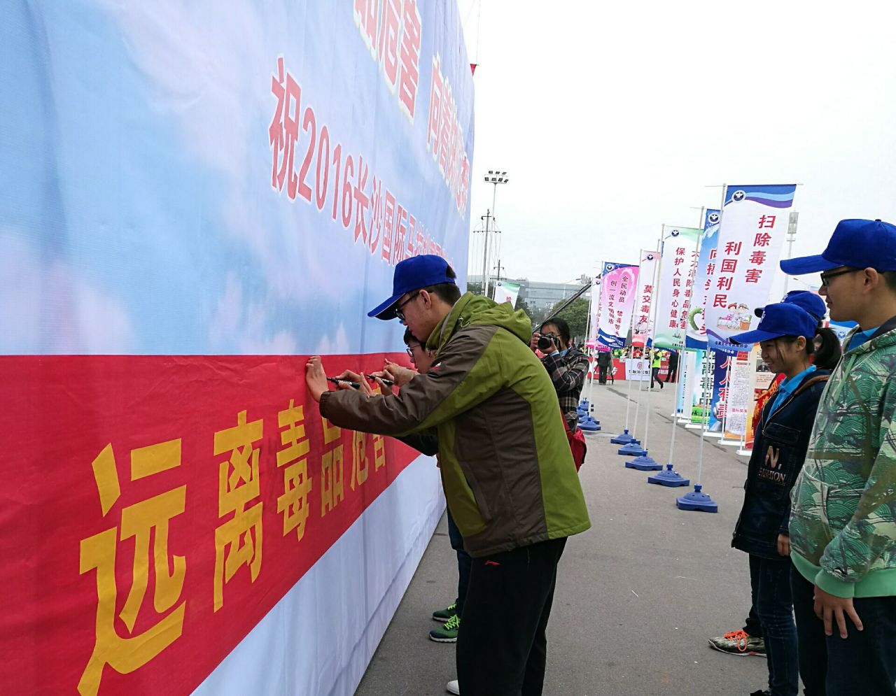 上午7点钟,来自三院的30名志愿者于活动现场集合完毕。随后岳麓区禁毒协会的负责人将任务下发到了各志愿者团队中,志愿者们将活动现场布置完毕后开始了紧锣密鼓的宣传工作。首先,志愿者们向等待马拉松比赛选手到达半程终点的观众发放了禁毒宣传手册和印有相关法律法规的手册,普及毒品常识,宣传禁毒工作。其次,志愿者进场参观的观众就展板内容进行了讲解,得到了观众的一致好评。在活动最后,志愿者们依次在印有“远离毒品危害,倡导健康生活”的条幅上签字,表示参加此次活动的志愿者将以身作则,在今后的生活里心向阳光,拒绝毒品,并以积极的态度感染身边的每一个人。