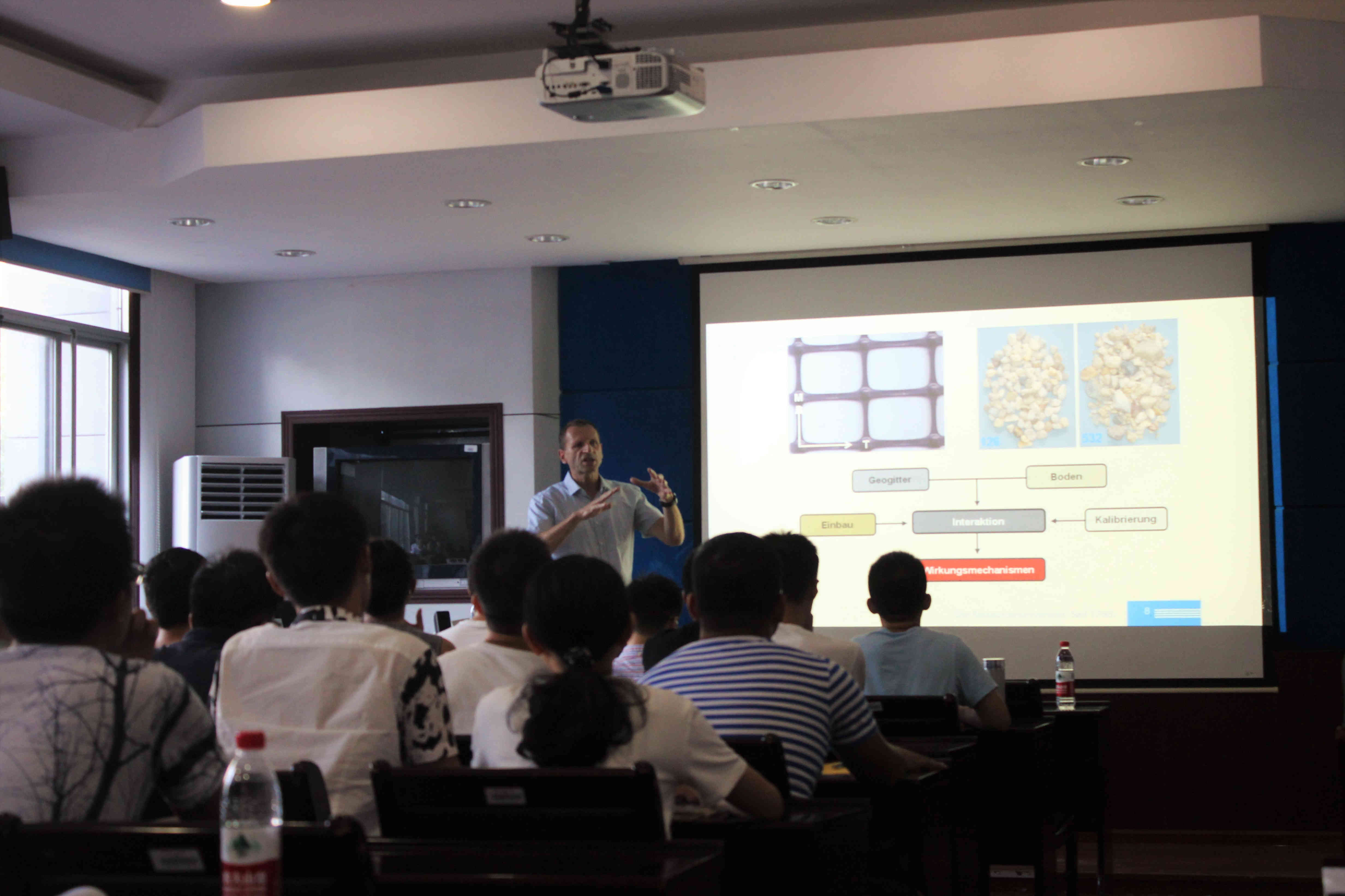 Heinz Konietzky教授讲座的主题包括“Behavior of Geogrids: numerical modeling and lab testing”、“Fractures under dynamic loading: lessons learned from shear box tests”、“Deep geothermal energy and induced seismicity”、“Simulation of cutting an drilling processes”等,讲座主要介绍了他的团队在岩石力学基础与应用方面的最新研究成果,内容涉及土工格栅特性的数值模拟与实验室验证、剪切盒测试与动荷载试验、深度地热能、水力压裂模拟、岩石切割与钻进破裂机制及其数值模拟分析等多个方面。参加讲座的教师及研究生人数累计达600余人次,与会成员围绕报告内容与Konietzky教授进行了热烈讨论。