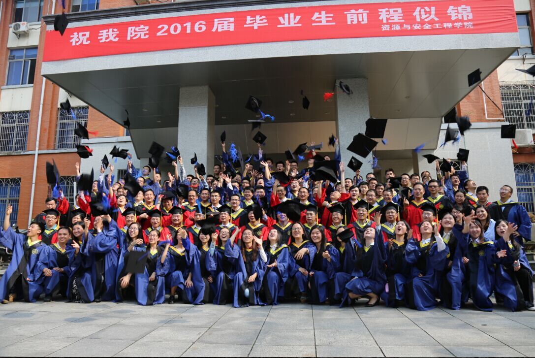 老师们于采矿楼前坪进行2016届全体毕业生合影留念。在将学士帽抛向天空的那一刻,全体毕业生仿佛挥出了自己扎根母校所付出的汗水,这一刻也意味着他们即将带着对母校的不舍和母校寄予的厚望踏足社会。整体合影结束后,毕业生们自发地以实验室为单位,热情的拉着导师合影留念,不放过任何间隙和任何角落,大家都希望能将对母校的留恋一瞬间全部都埋入心底,刻入胶片中。