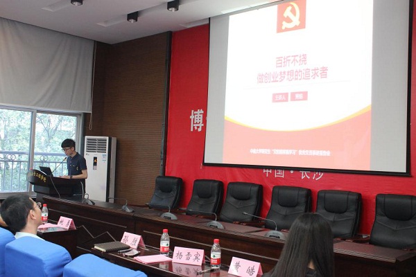 13级研究生黄皓同学来分享他的优秀事迹。他的报告主题为“百折不挠,做创业梦想的追求者”,此次报告分为“冷板凳上的热血青春”、“时代责任萌生创业实践”以及“仰望星空,温暖人心”三个部分,通过此次报告,将榜样的力量传递给了各位在场党员。