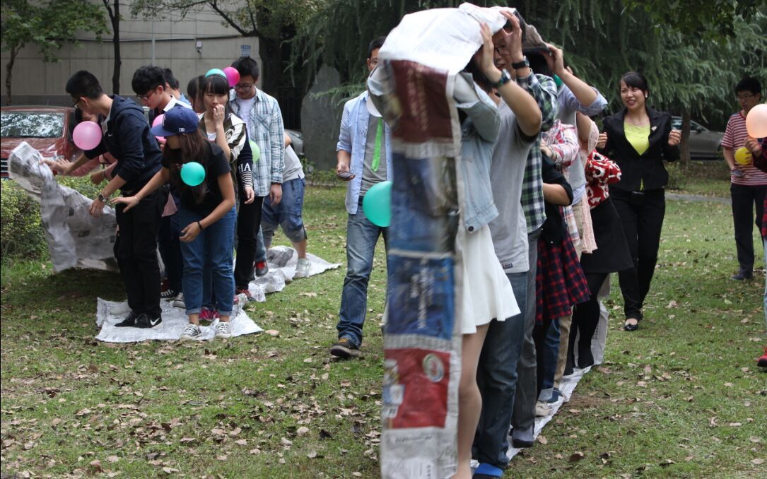 在第一个小组展示过后,便开始了重头戏环节“风火轮”。每组发放一些报纸与胶带,队伍成员内部讨论“战术”,要求每组所有成员在规则要求下走完设定的路程,以最快到达终点的组为优胜。比赛开始后,各个小队可谓八仙过海各显神通,有的队伍设计风火轮简洁环保,体现对资源利用的环保高效;有的队伍喊着统一的口号一步步向终点迈进,彰显出我们资安学子的团结协作坚韧不拔。