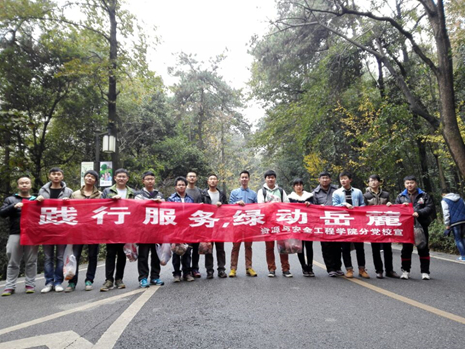 11月29日,资安院分党校组织了“践行服务,绿动岳麓”社会实践活动。在此次公益活动中,同学们表现积极,在上山的过程中争取不放过一点垃圾,尤其是塑料袋。一路上山,山路上零零散散的垃圾不见了,沿途的山路变成了一条绿带;到山顶处,同学们把垃圾袋聚成一堆,不少过路的游人投来肯定的眼光。