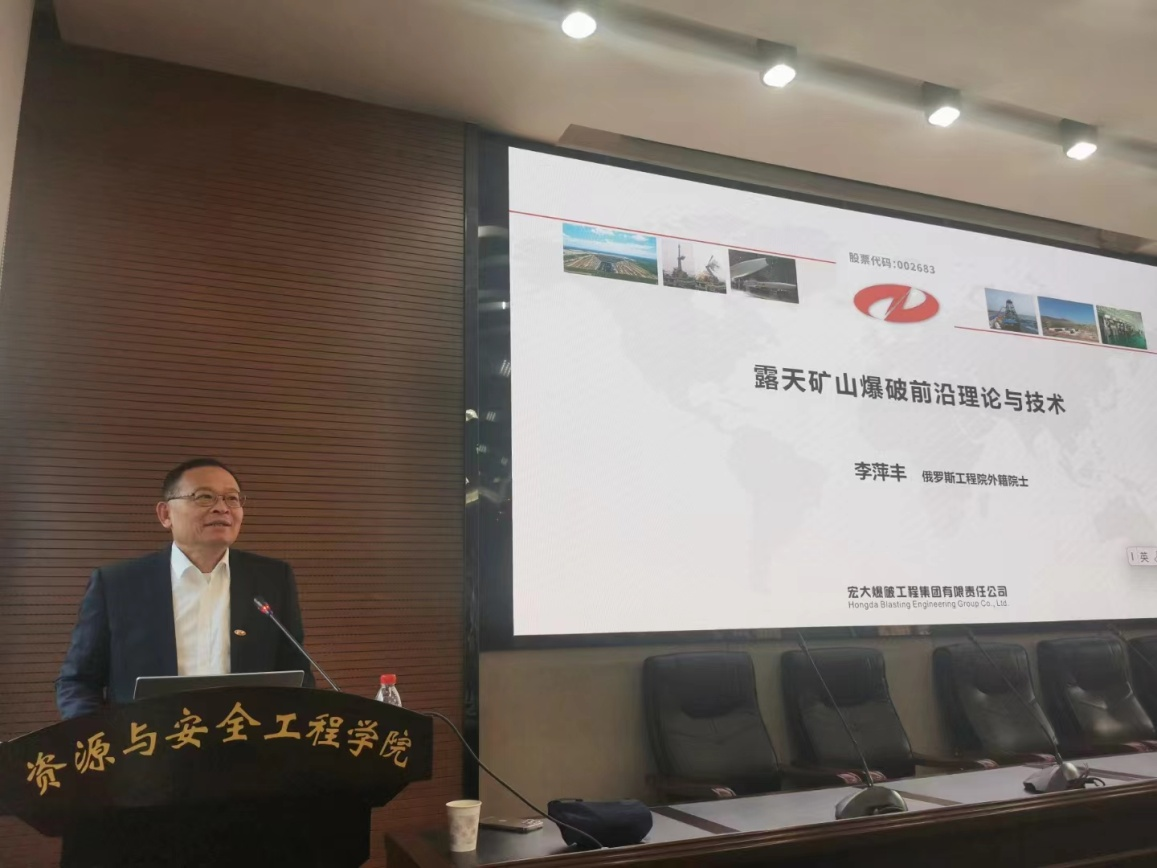 李萍丰教授在报告中介绍了露天矿山爆破发展历史,讲述从近代到现代爆破技术不同时期的特点以及爆破技术的发展历程。从露天矿山精准爆破技术的客户需求出发,介绍了最新的爆破技术可实现根据客户的不同需求将矿山爆破成特定的形状,做到精确全面供应。他强调了露天矿山智能爆破技术的智能性,该技术可以做到真正的智能化,精确识别现场人员位置,从而避免人员伤亡。报告会最后,李萍丰教授与师生进行了学术交流,回答了现场学生提问,并鼓励采矿专业学生积极参与爆破技术研发,为该领域的发展添砖加瓦。