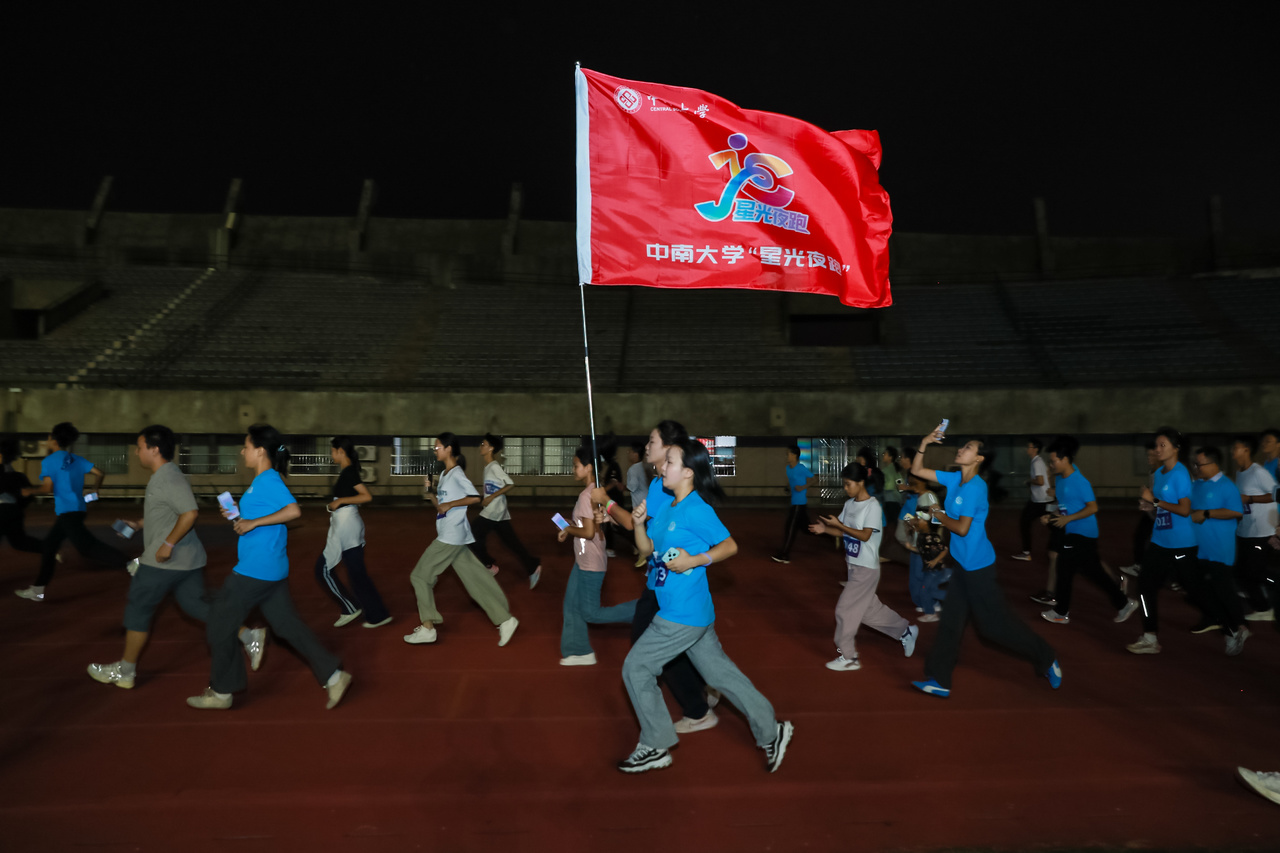 师生们在专业人员带领下舒展身体、活络筋骨。随着开跑口令的响亮发出,鲜红的活动旗帜在夜色中率先扬起,师生们紧随其后,脚步声与音乐律动共振,呼吸声与夜风细雨相融,大家热情奔跑、你追我赶、互相鼓劲,荧光手环与沿途灯光交织成校园夜景中的流动星河,营造了浓厚的校园运动氛围,生动展现了中南学子的昂扬风貌。