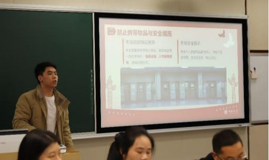 活动伊始,辅导员陈一戈结合考研相关安排为同学们详细解读了注意事项与考试纪律,提醒大家诚信应考,同时细致地向大家介绍了考研整体流程。