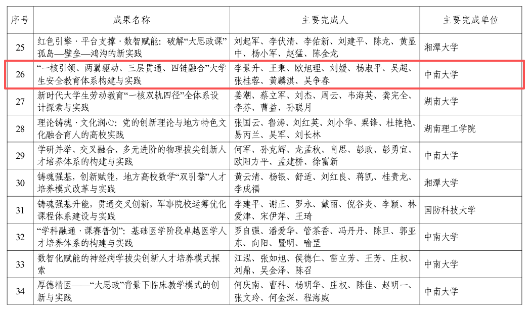 近日,2025年湖南省高等教育教学成果奖的获奖成果名单公布。由我院牵头,联合学生工作部(处)、公共管理学院、马克思主义学院等共同完成申报的《“一核引领、两翼驱动、三层贯通、四链融合”大学生安全教育体系构建与实践》教学成果脱颖而出,荣获省级特等奖,实现我院在省级教学成果奖新突破,彰显了我院在大学生安全教育教学与实践方面的显著成效和实力。